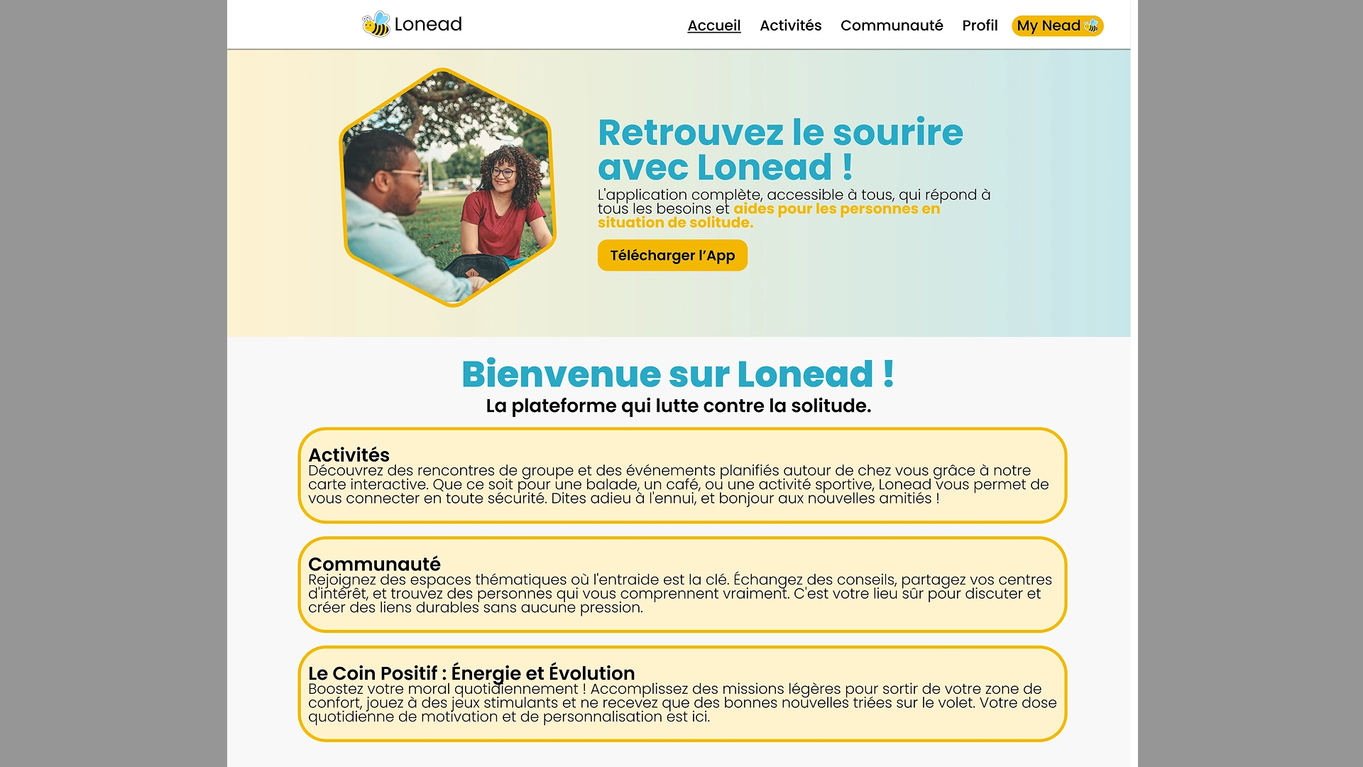 Lonead est un projet de plateforme qui lutte contre la solitude. La plateforme aide les utilisateurs grâce à différentes fonctionnalités comme l’organisation d’activités, des communautés, des discussions avec des professionnels de santé, etc.